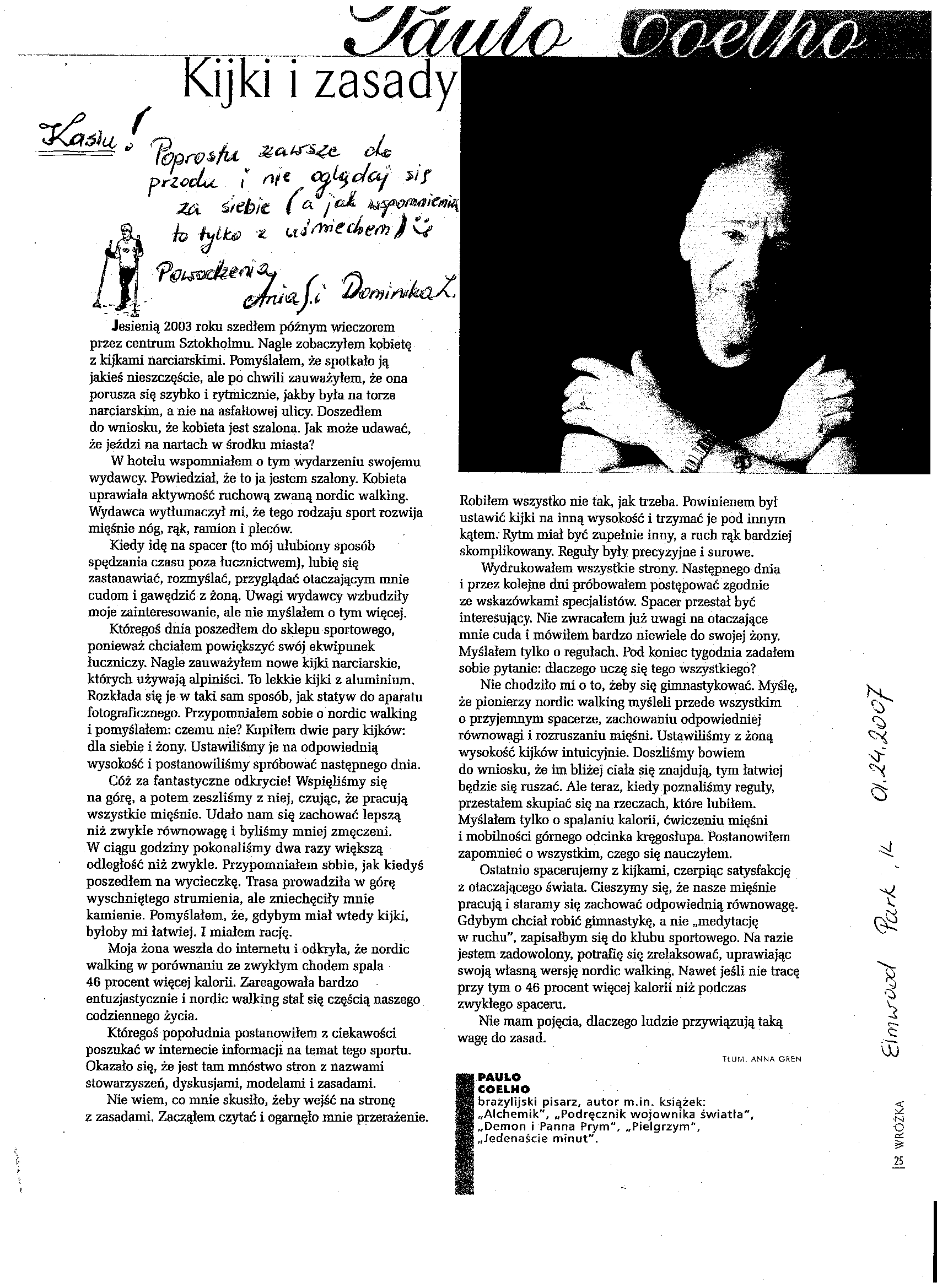 Zapewne nie każdy z Was wie, że Pisarz jest także pasjonatem spacerowania z kijkami. Swoje spostrzeżenia i odczucia zawarł w: ,,Kijki i reguły”, jednej z publikacji z cyklu ,,Wojownik Światła”. Zarówno Śp. Kasia (ciągle mi o tym przypomina), jak i ja bardzo byśmy chcieli, aby ten artykuł stał się dla Was, moi drodzy miłośnicy tej cudownej prozdrowotnej aktywności, taką inspiracją, jaką stały się jego dzieła. Zanim zagłębicie się w lekturze, pozwólcie, że wyjaśnię Wam, w jaki sposób ten artykuł trafił w Jej ręce.